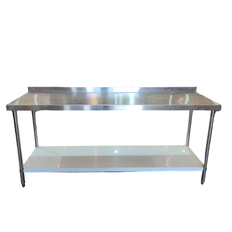 Fabricado completamente en acero inoxidable AISI 201 de 1,5 mm de espesor, incorpora una viga de refuerzo en perfil 30x30 mm, que garantiza estabilidad estructural a lo largo de toda la cubierta. Incluye un respaldo mural sanitario de 10 cm de altura, ideal para mantener la higiene en zonas de preparación. Sus patas de perfil tubular de alta resistencia y patines regulables aseguran un ajuste perfecto a distintos tipos de pisos.