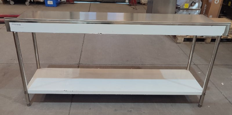 Un mesón mural de acero inoxidable robusto y versátil, ideal para cocinas profesionales, laboratorios, talleres y espacios que requieren superficies resistentes y bien organizadas.