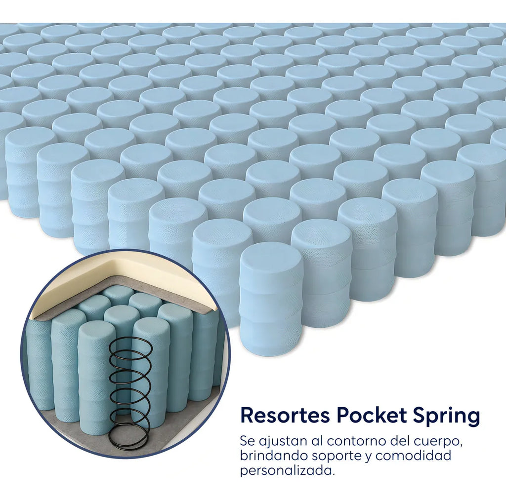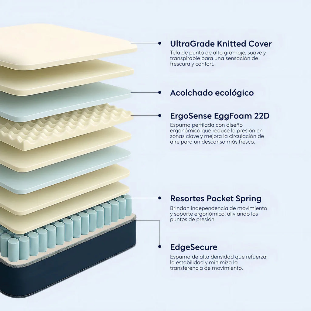Con un perfil de 25 cm de altura, brinda el equilibrio ideal entre soporte y comodidad, adaptándose a la forma natural del cuerpo para un sueño reparador. Su cubierta en color blanco, elegante y resistente, garantiza frescura, higiene y durabilidad.