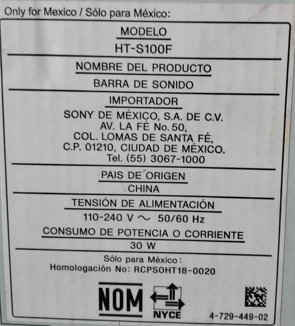 🔊 Soundbar Sony HT-S100F – Potencia 110-240 V / 50-60 Hz