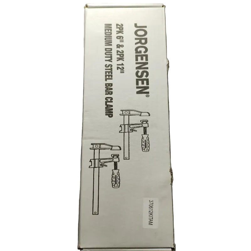 El juego de 4 abrazaderas Jorgensen incluye abrazaderas de 6 pulgadas y 12 pulgadas con barras de acero y acabado en color naranja, diseñadas para aplicar presión de manera firme y segura en trabajos de carpintería, montaje y sujeción de piezas durante pegado o armado.