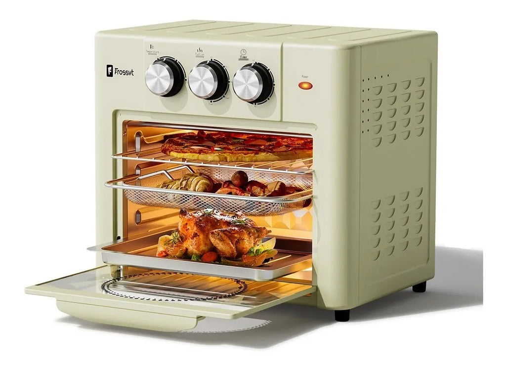 🍟 Transforma tus comidas favoritas en versiones mas saludables con la Freidora de Aire Frossvt Green 2. Ideal para familias o quienes buscan reducir el consumo de aceite sin sacrificar el sabor crujiente. Este modelo de 18 litros, con potencia de 1800W y panel de control digital, es perfecto si necesitas un electrodoméstico versátil y de gran capacidad. Su tecnología de aire caliente circulante te permite freír, asar, hornear, grillar, rostizar, recalentar y descongelar, logrando resultados dorados y deliciosos con hasta un 85% menos de grasa. La canasta extraíble y antiadherente facilita una limpieza rápida, mientras que su diseño moderno en color verde se integra a cualquier cocina. Disfruta de papas fritas, alitas, pastelería y mucho mas, de manera practica, económica y mas saludable para el día a día.Estado de Producto: Caja abierta/ Open Box/ Reacondicionado/ Refurbished - Garantía de 6 meses