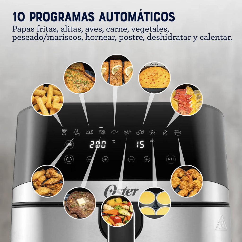 🍟 Transforma tu cocina con la Freidora de Aire Digital Oster, tu aliada perfecta para preparar comidas mas crujientes y saludables con hasta un 75% menos de grasa. Ideal para familias o quienes buscan una alternativa rápida y deliciosa a la fritura tradicional, su capacidad de 7.5 litros te permite cocinar porciones generosas de papas fritas, alitas, pastelitos o incluso asar un pollo entero. Su tecnología de aire caliente ciclónico garantiza una cocción uniforme y resultados dorados por todos lados, mientras que el panel digital táctil con 7 programas preestablecidos (como papas fritas, carne, mariscos y horneado) hace que cocinar sea sumamente fácil y preciso. La función de inicio retardado te permite programar la cocción con anticipación, y su canastillo y cesta antiadherentes y desmontables facilitan una limpieza rápida. Disfruta de tus alimentos favoritos con textura y sabor increíbles, pero con mucha menos grasa y calorías, gracias a este electrodoméstico moderno, eficiente y confiable que se convertirá en un esencial de tu cocina.